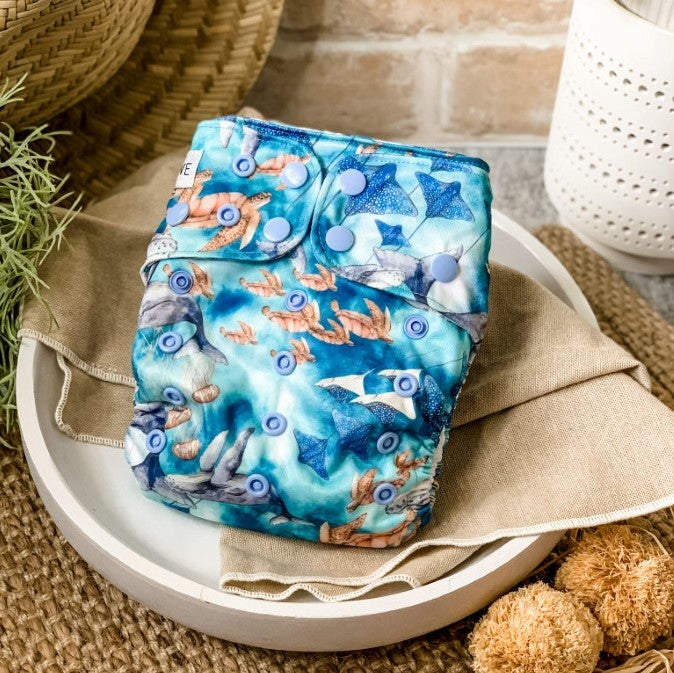 The ultra soft stay-dry lining made of athletic wicking jersey wicks away the moisture from the skin, keeping bub cool and dry. At the front of the diaper, the PUL tummy panel offers extra leak protection and prevents pee from wicking onto bub’s shirt. The wide but firm elastic at the back of the diaper ensures that all poop is contained within the diaper, without being too harsh on bub’s skin.