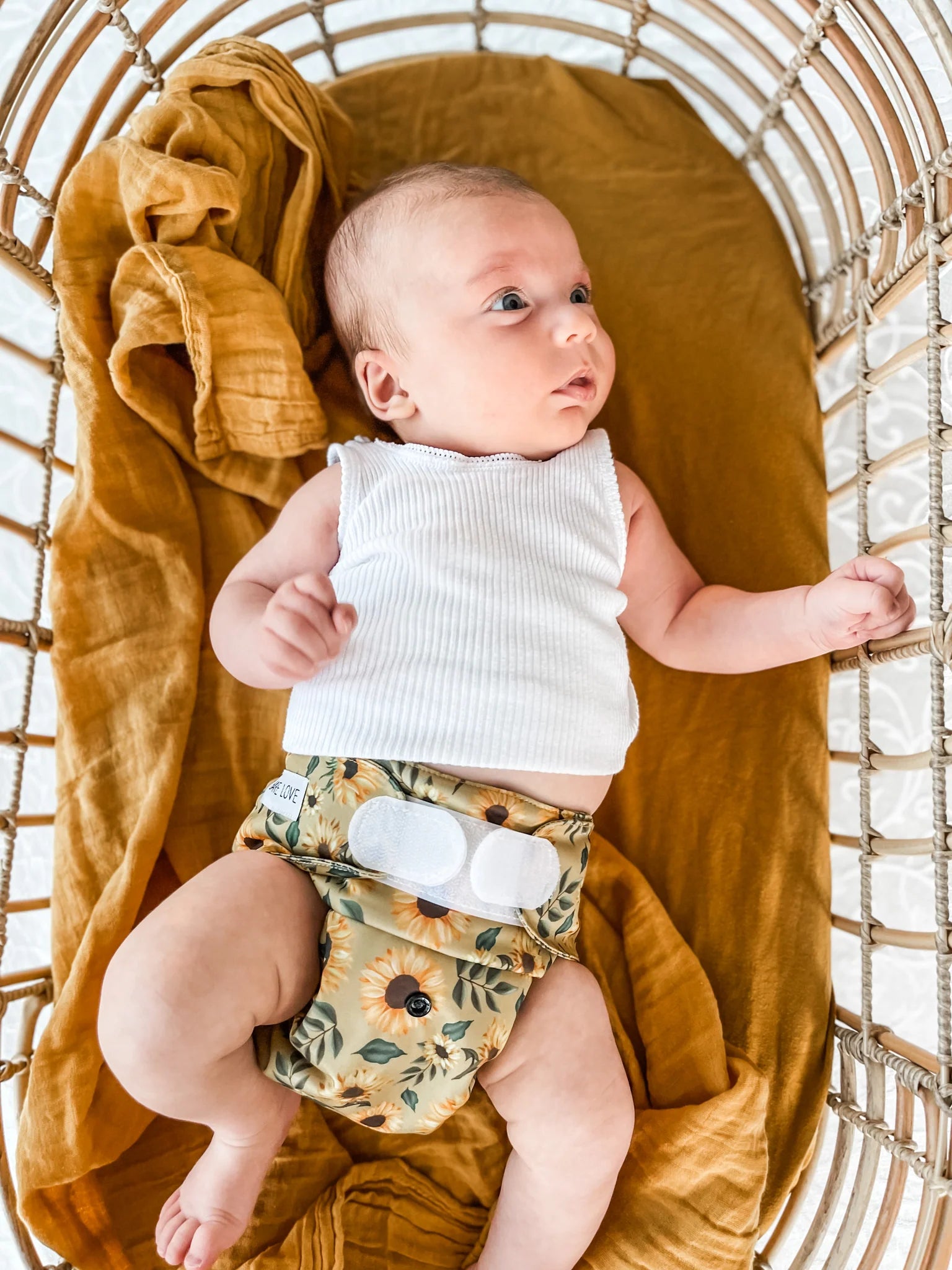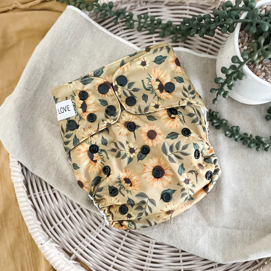 The ultra soft stay-dry lining made of athletic wicking jersey wicks away the moisture from the skin, keeping bub cool and dry. At the front of the diaper, the PUL tummy panel offers extra leak protection and prevents pee from wicking onto bub’s shirt. The wide but firm elastic at the back of the diaper ensures that all poop is contained within the diaper, without being too harsh on bub’s skin.