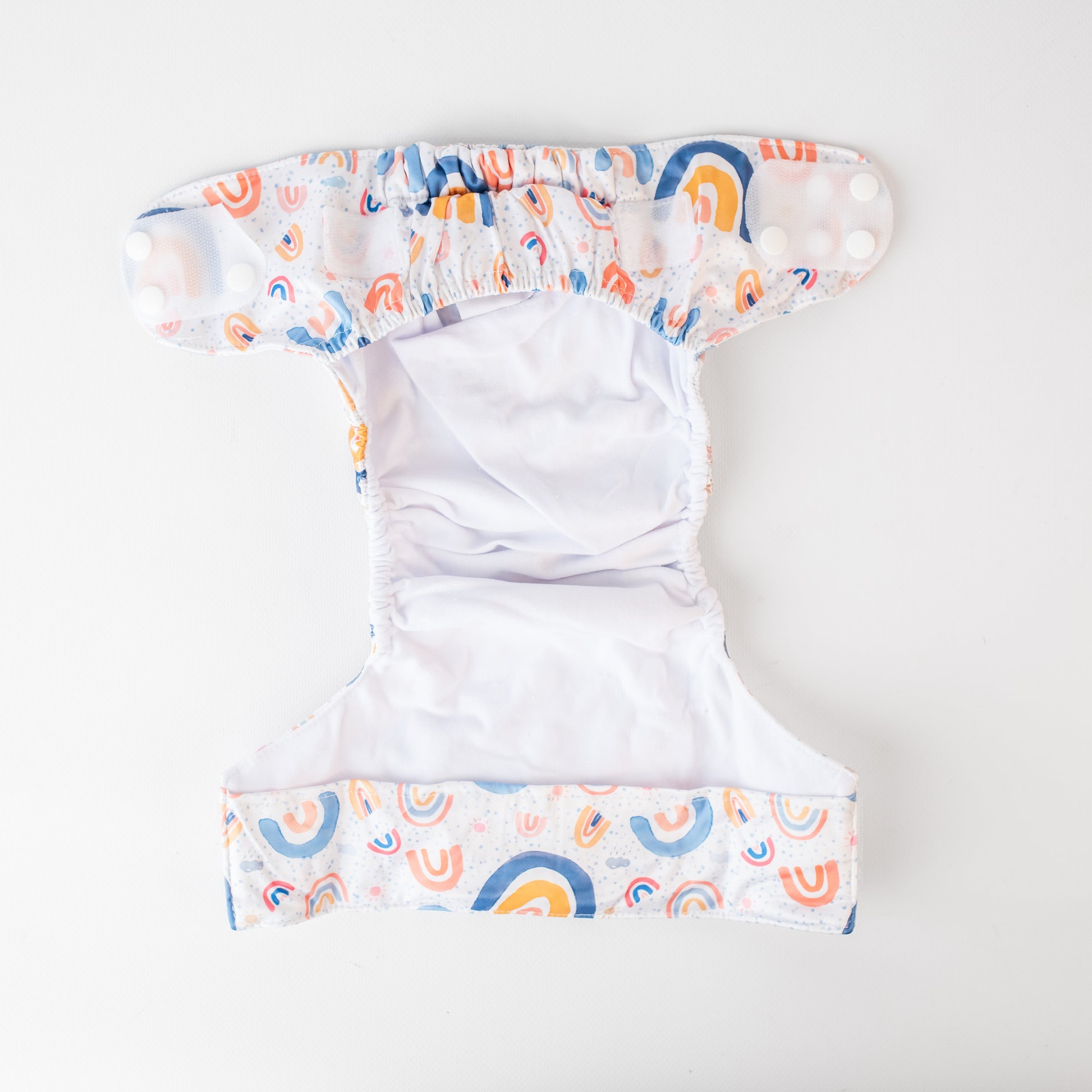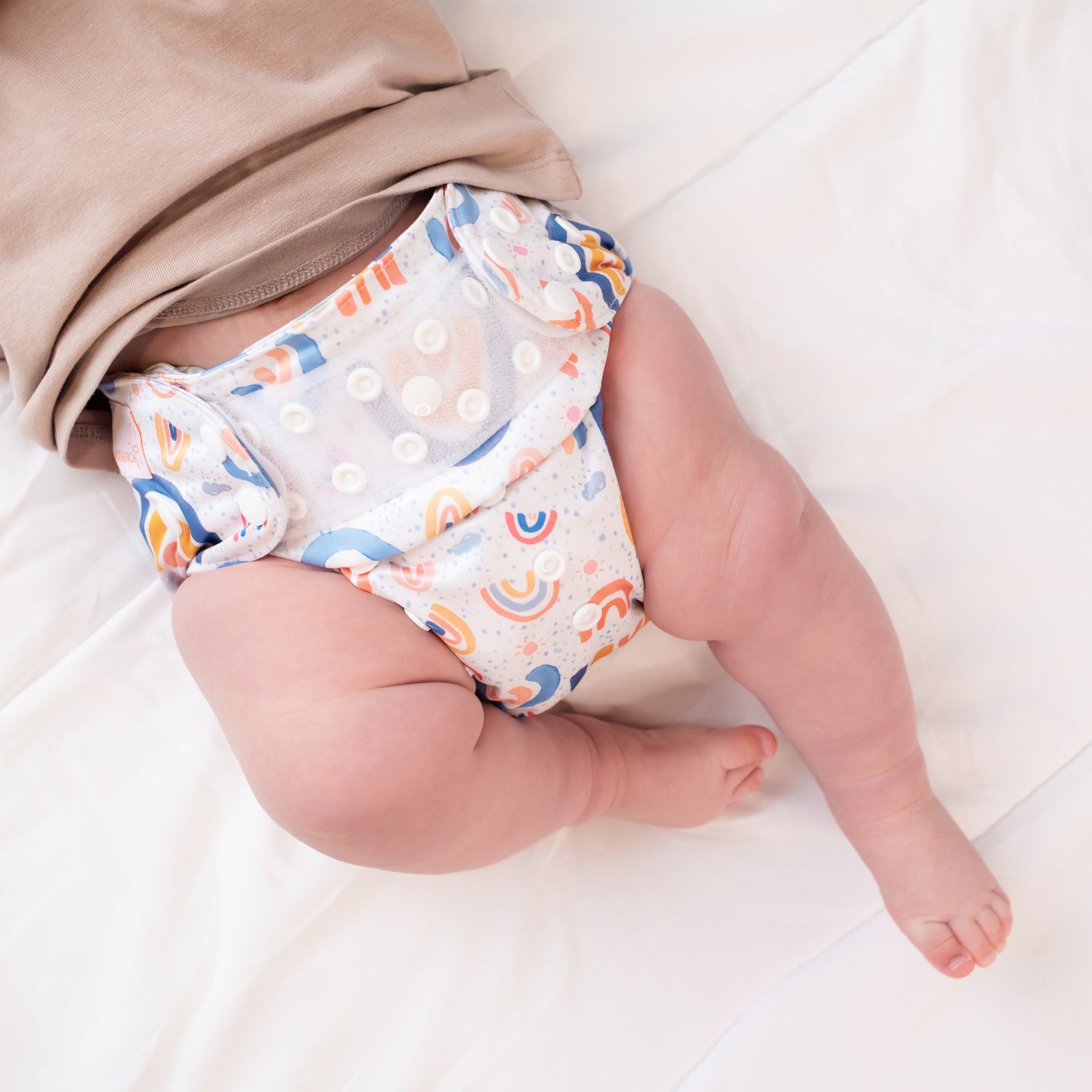The interior of the nappy shell is lined with stay-dry suede cloth which is excellent at drawing away moisture and keeping bub's bottom cool and dry. The waterproof front and back flaps help to keep the moisture from sitting against bub's stomach and back for extended periods of time.
