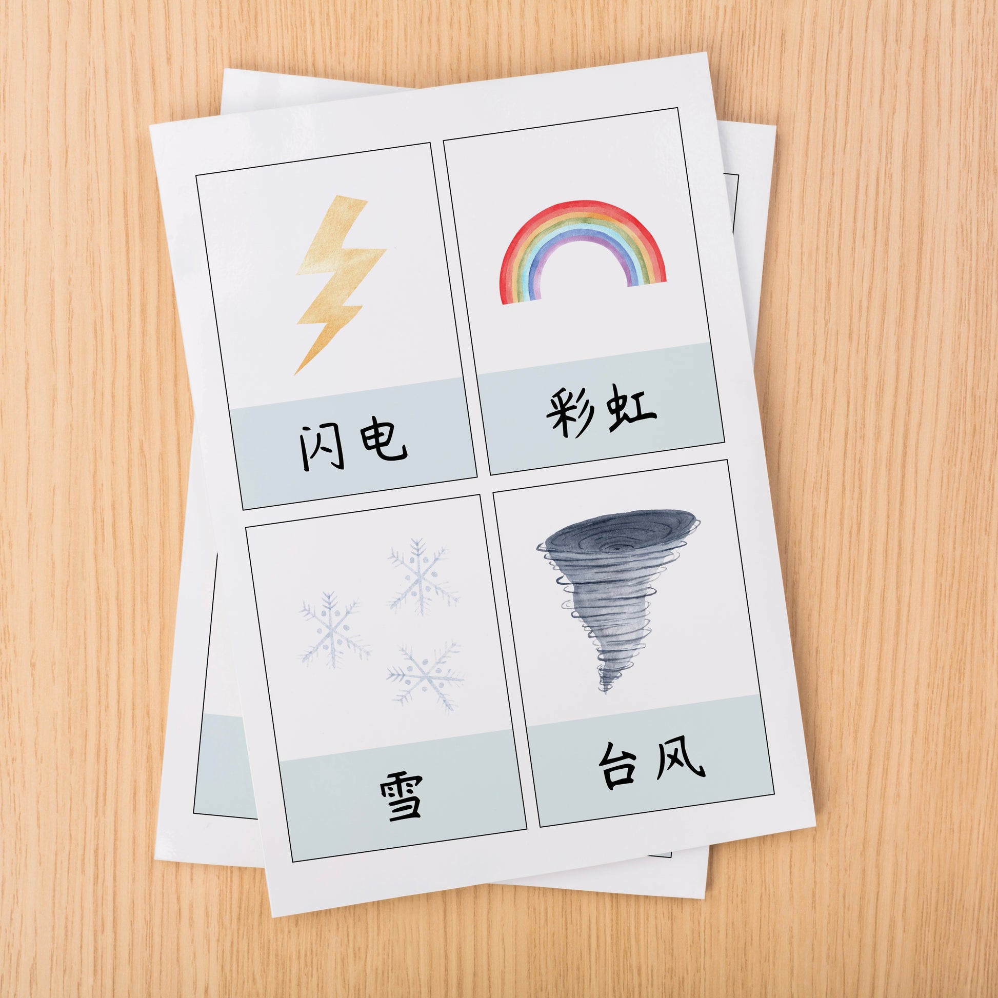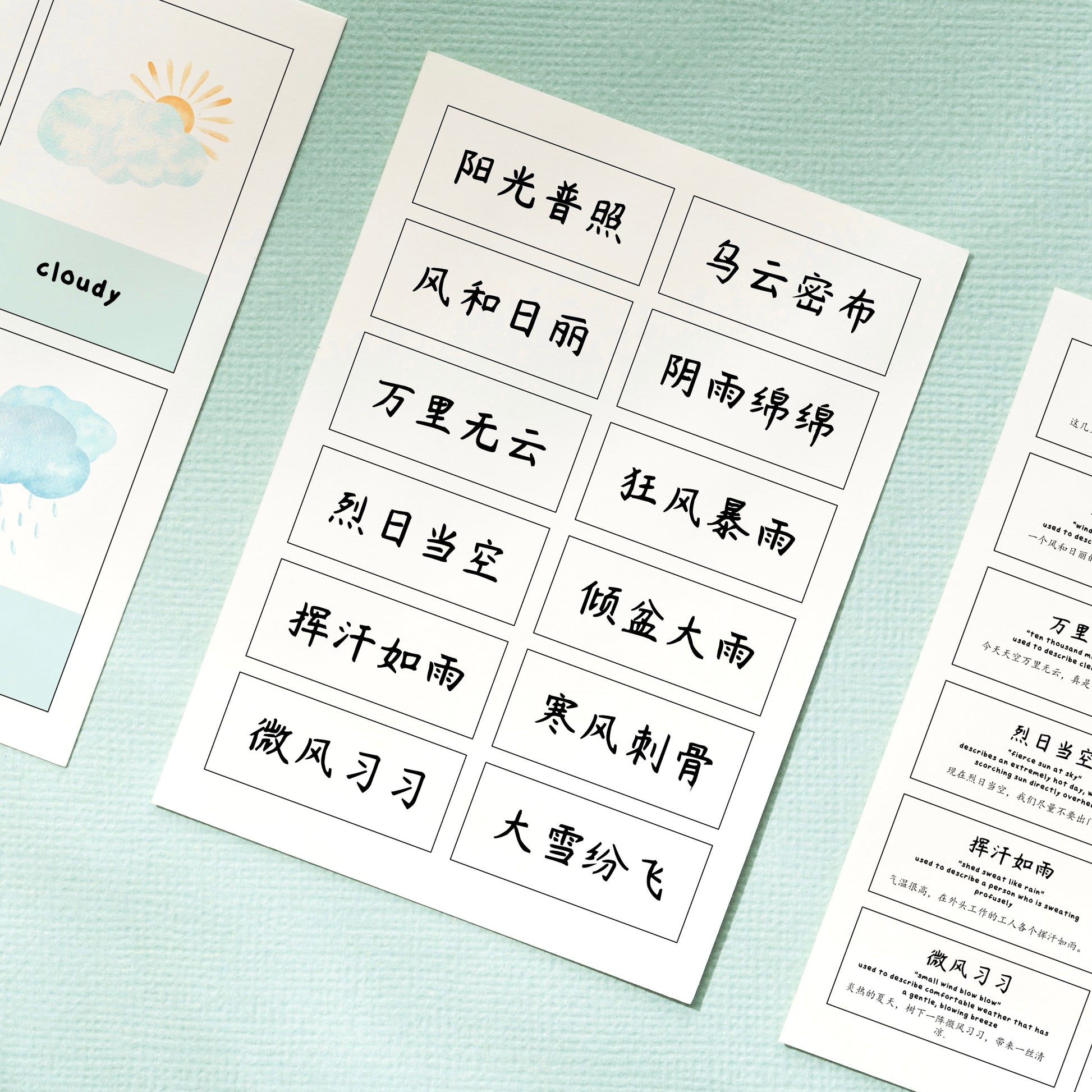 The accompanying set of Montessori language cards and 成语 (Chinese idioms) is ideal for kindergarten and primary school children: play matching games or writing quizzes to learn weather descriptions in a fun way.