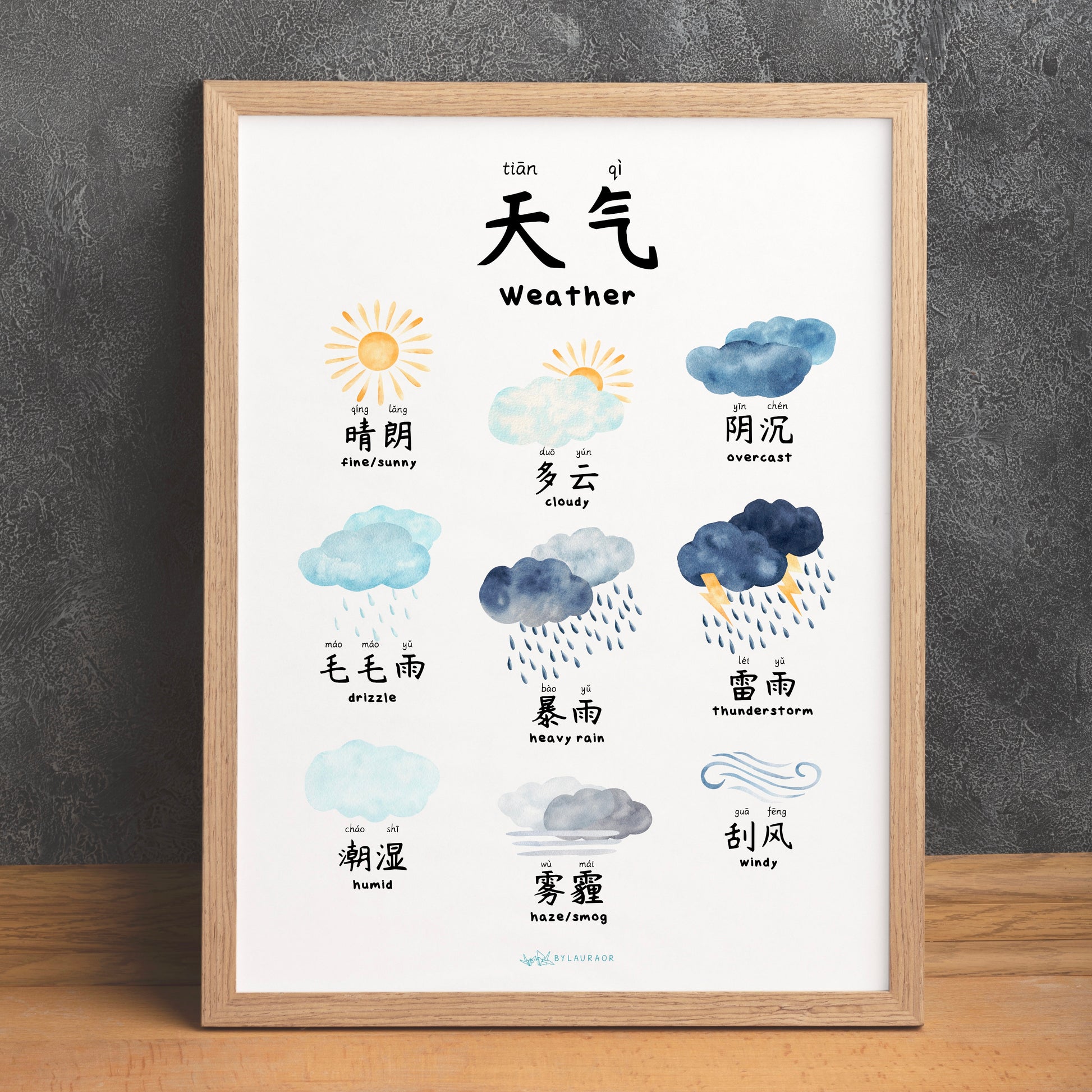 This English-Mandarin bilingual watercolour weather poster is great for helping young children learn new Chinese words in an authentic and fun way. Hang it next to the door or a window to help preschoolers learn more about the world around them.