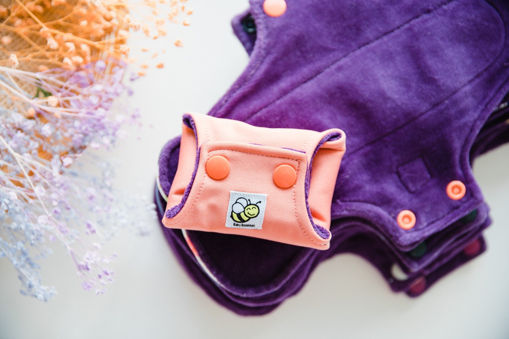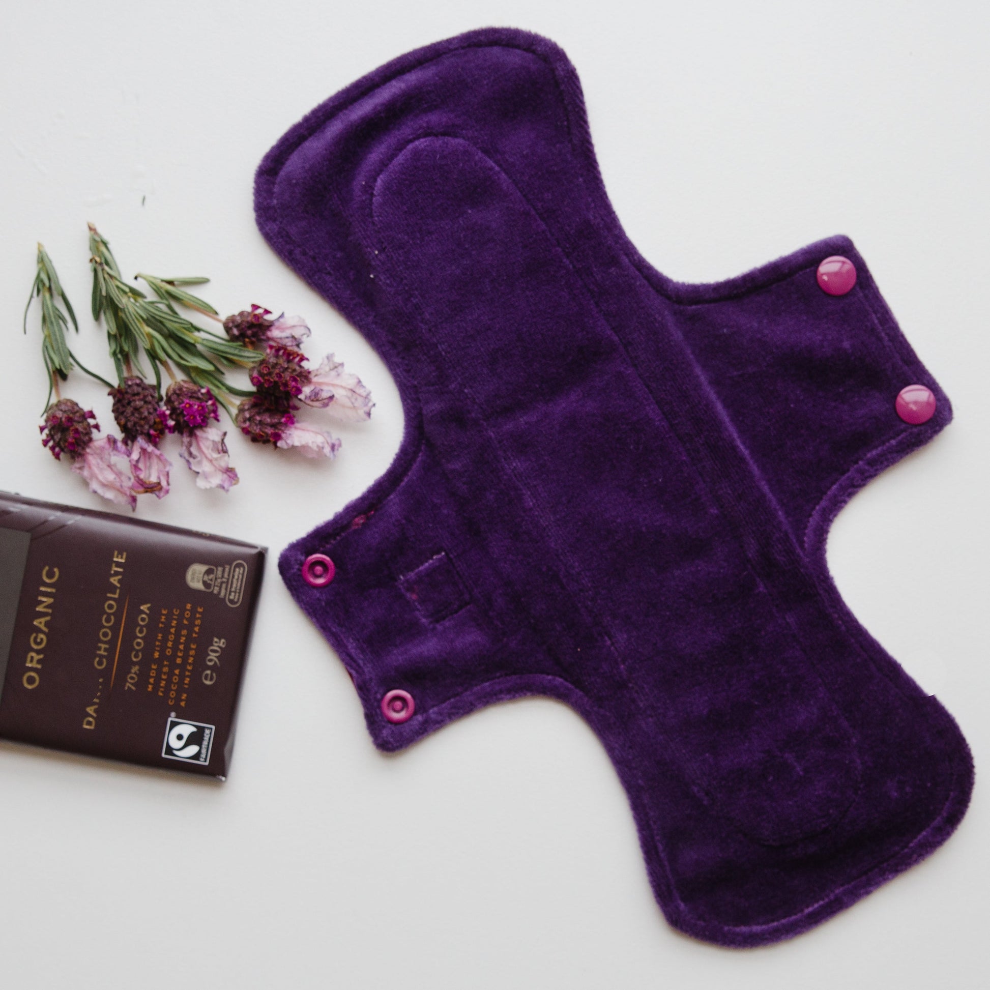 These Baby Beehinds cloth pads are designed with the softest dark purple, organic cotton velour against your skin and water resistant backing to protect your underwear. They come in four sizes to suit your different needs.